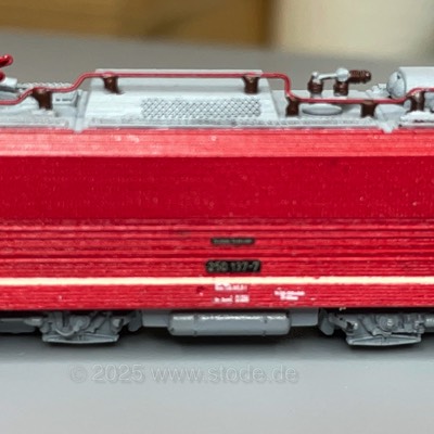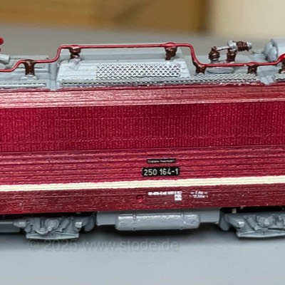 BR 250 DR: Gehäuse von Shapeways, Lichteinsätze von der Märklin 143er. Stromabnehmer passen eigentlich nicht (SBB von Weinert), sehen aber immer noch besser aus, als die ebensowenig passenden Märklin-Teile. Die Fahrwerke von alten DB 103ern oder 151ern wurden aufgearbeitet, haben Glockenankermotoren und mehr Gewicht bekommen. Haftreifen gehören ebenso wie ein Decoder zur Ausstattung.